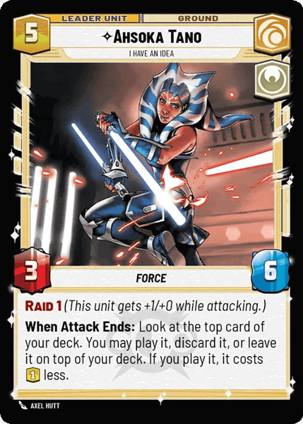 Hero Ability: When you play an event: You may exhaust this leader. If you do, look at the top card of your deck. You may play it (paying its cost), discard it, or leave it on top of your deck.
