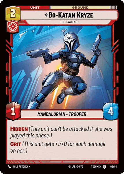 Hidden (This unit can't be attacked if she was played this phase.) Grit (This unit gets +1/+0 for each damage on her.)