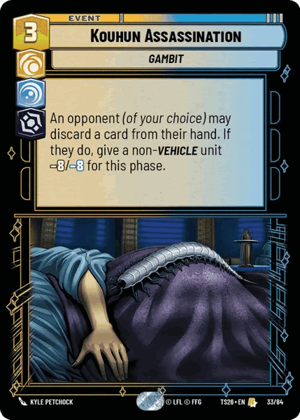 An opponent (of your choice) may discard a card from their hand. If they do, give a non-Vehicle unit -8/-8 for this phase.