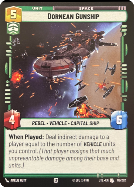 When Played: Deal indirect damage to a player equal to the number of Vehicle units you control. (That player assigns that much unpreventable damage among their base and units.)