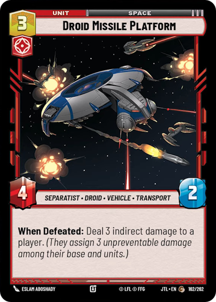 When Defeated: Deal 3 indirect damage to a player. (They assign 3 unpreventable damage among their base and units.)