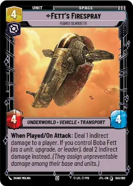 When Played/On Attack: Deal 1 indirect damage to a player. If you control Boba Fett (as a unit, upgrade, or leader), deal 2 indirect damage instead. (They assign unpreventable damage among their base and units.)