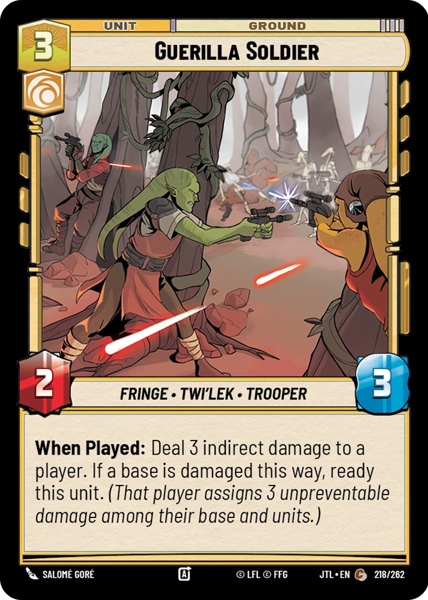 When Played: Deal 3 indirect damage to a player. If a base is damaged this way, ready this unit (That player assigns 3 unpreventable damage among their base and units.)