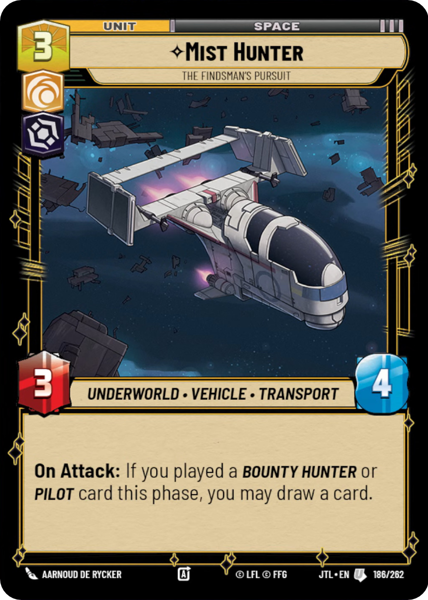 On Attack: If you played a Bounty Hunter or Pilot card this phase, you may draw a card.