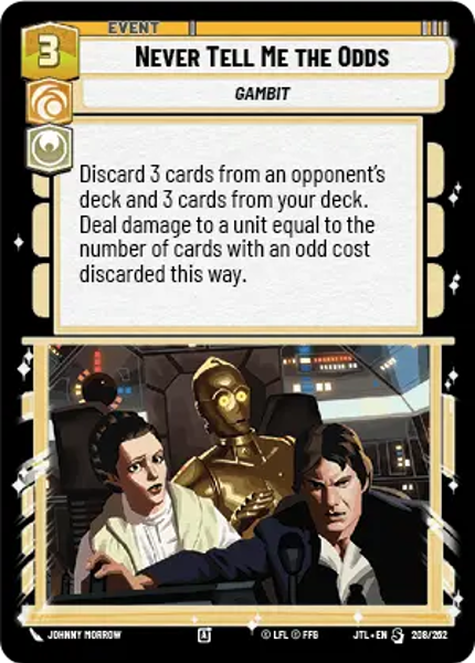 Discard 3 cards from an opponent's deck and 3 cards from your deck. Deal damage to a unit equal to the number of cards with an odd cost discarded this way.