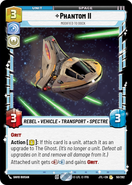 Action [1]: If this card is a unit, attach it as an upgrade to The Ghost. (It's no longer a unit. Defeat all upgrades on it and remove all damage on it.)