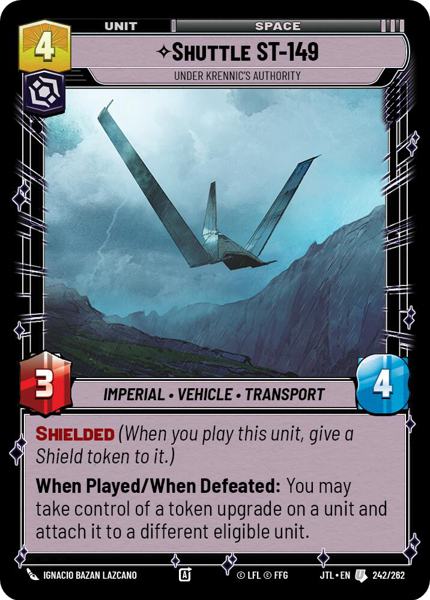 When Played/When Defeated: You may take control of a token upgrade on a unit and attach it to a different eligible unit.