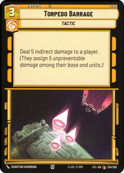 Deal 5 indirect damage to a player. (They assign 5 unpreventable damage among their base and units.)