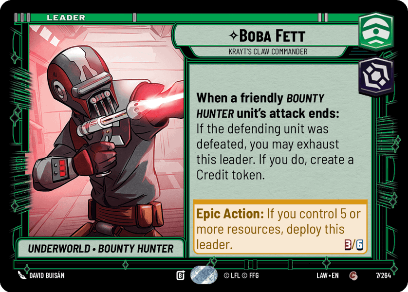 Hero Ability: When a friendly Bounty Hunter unit's attack ends: If the defending unit was defeated, you may exhaust this leader. If you do, create a Credit token.