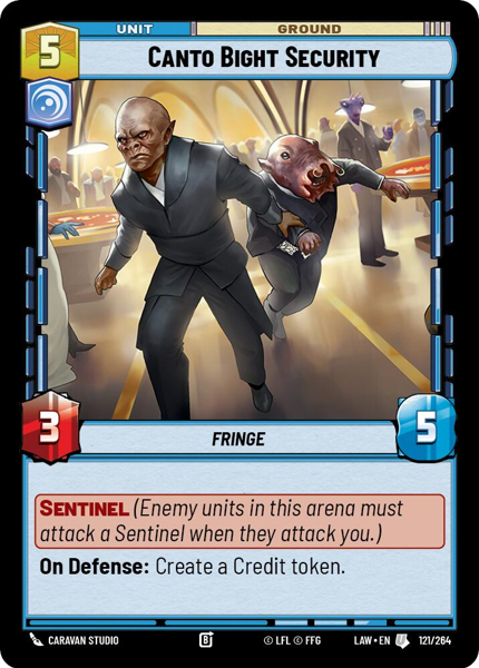 Sentinel (Enemy units in this arena must attack a Sentinel when they attack you.) On Defense: Create a Credit token.