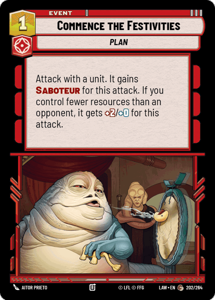 Attack with a unit. It gains Saboteur for this attack. If you control fewer resources than an opponent, it gets +2/+0 for this attack.