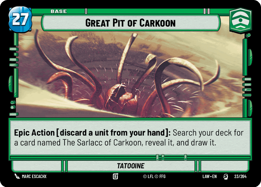 Epic Action [discard a unit from your hand]: Search your deck for a card named The Sarlacc of Carkoon, reveal it, and draw it.