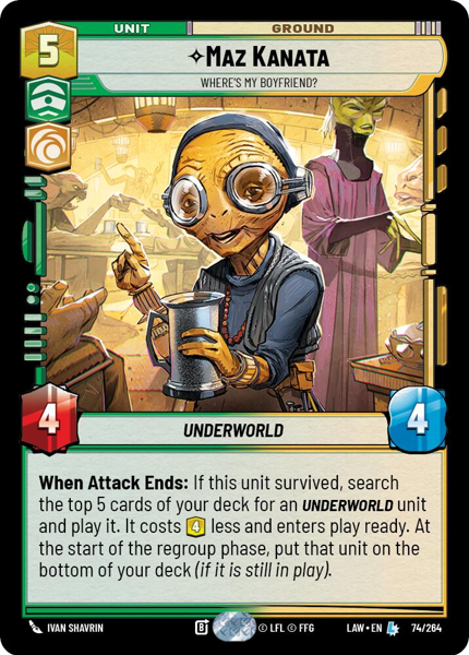 When Attack Ends: If this unit survived, search the top 5 cards of your deck for an Underworld unit and play it. It costs 4 less and enters play ready. At the start of the regroup phase, put that unit on the bottom of your deck (if it is still in play).