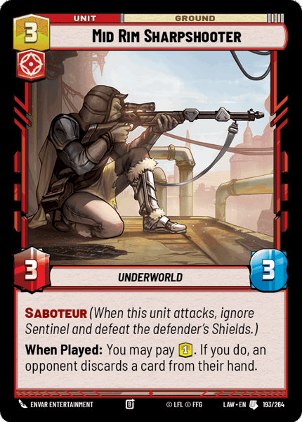 Saboteur (When this unit attacks, ignore Sentinel and defeat the defender's Shields.) When Played: You may pay 1. If you do, an opponent discards a card from their hand.