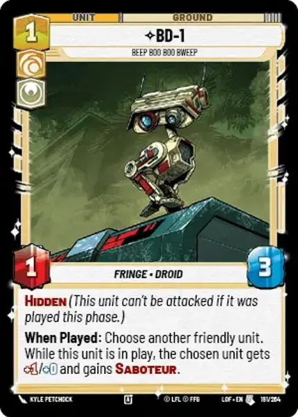 When Played: Choose another friendly unit. While this unit is in play, the chosen unit gets +1/+0 and gains Saboteur.