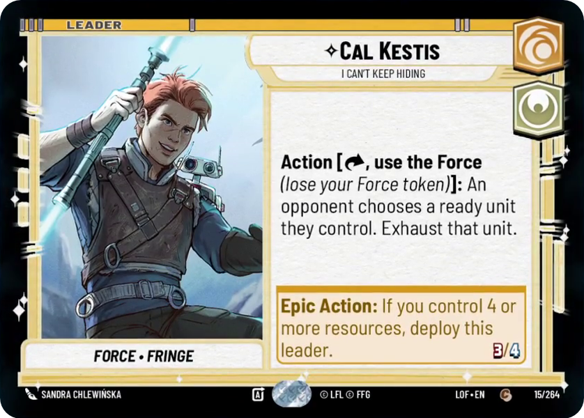 Hero Ability: Action [[tap], use the Force (lose your Force token)]: An opponent chooses a ready unit they control. Exhaust that unit.