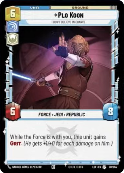While the Force is with you, this unit gains Grit. (He gets +1/+0 for each damage on him.)