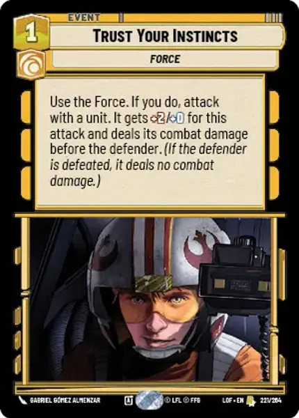 Use the Force. If you do, attack with a unit. It gets +2/+0 for this attack and deals its combat damage before the defender. (If the defender is defeated, it deals no combat damage.)