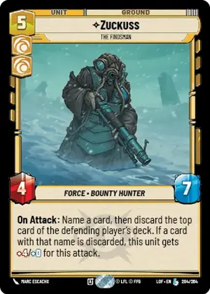 On Attack: Name a card, then discard the top card of the defending player's deck. If a card with that name is discarded, this unit gets +4/+0 for this attack.