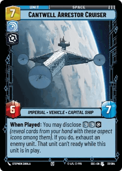 When Played: You may disclose [vigilance] [vigilance] [villainy] (reveal cards from your hand with these aspect icons among them). If you do, exhaust an enemy unit. That unit can't ready while this unit is in play.