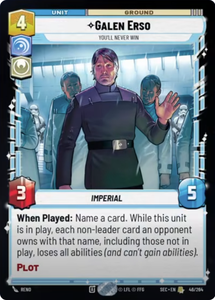 When Played: Name a card. While this unit is in play, each non-leader card an opponent owns with that name, including those not in play, loses all abilities (and can't gain abilities). Plot