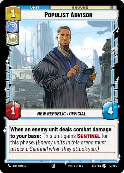 When an enemy unit deals combat damage to your base: This unit gains Sentinel for this phase. (Enemy units in this arena must attack a Sentinel when they attack you.)