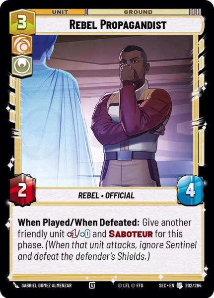 When Played/When Defeated: Give another friendly unit +1/+0 and Saboteur for this phase. (When that unit attacks, ignore Sentinel and defeat the defender's Shields.)