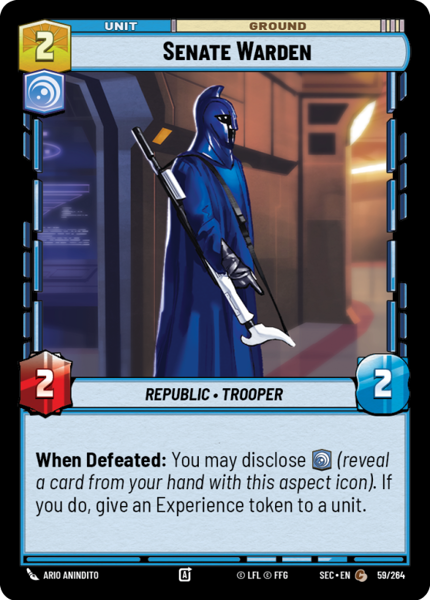 When Defeated: You may disclose [vigilance] (reveal a card from your hand with this aspect icon). If you do, give an Experience token to a unit.