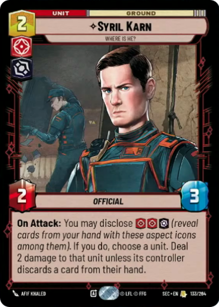 On Attack: You may disclose [aggression] [aggression] [villainy] (reveal cards from your hand with these aspect icons among them). If you do, choose a unit. Deal 2 damage to that unit unless its controller discards a card from their hand.