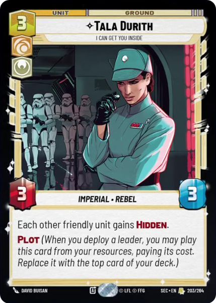 Each other friendly unit gains Hidden. Plot (When you deploy a leader, you may play this card from your resources, paying its cost. Replace it with the top card of your deck.)