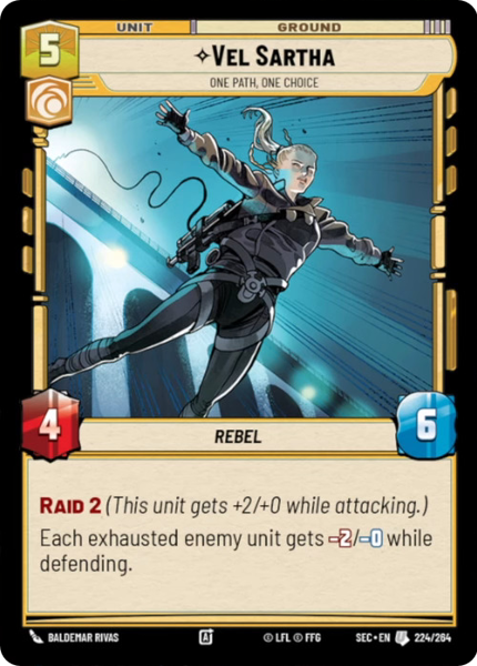 Raid 2 (This unit gets +2/+0 while attacking.) Each exhausted enemy unit gets -2/-0 while defending.