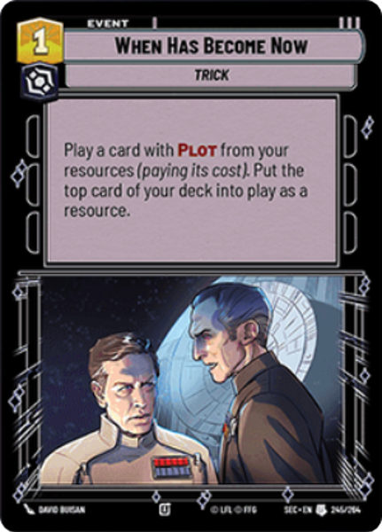 Play a card with Plot from your resources (paying its cost). Put the top card of your deck into play as a resource.