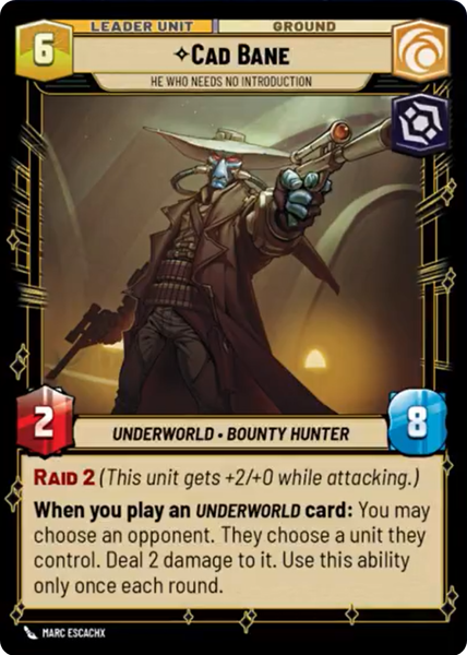 Hero Ability: When you play an Underworld card: You may exhaust this leader. If you do, an opponent chooses a unit they control. Deal 1 damage to it.