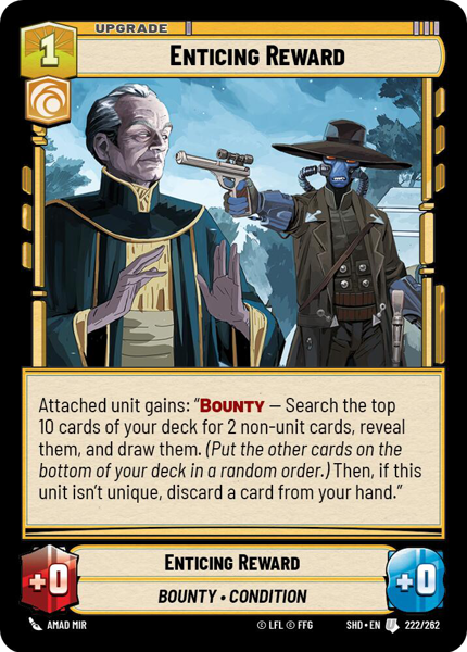 Attached unit gains: "Bounty - Search the top 10 cards of your deck for 2 non-unit cards, reveal them, and draw them. (Put the other cards on the bottom of your deck in a random order.) Then, if this unit isn't unique, discard a card from your hand."