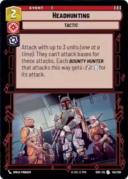 Attack with up to 3 units (one at a time). They can't attack bases for these attacks. Each Bounty Hunter that attacks this way gets +2/+0 for its attack.
