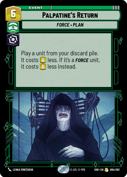 Play a unit from your discard pile. It costs 6 less. If it's a Force unit, it costs 8 less instead.