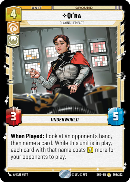 When Played: Look at an opponent's hand, then name a card. While this unit is in play, each card with that name costs 3 more for your opponent to play.