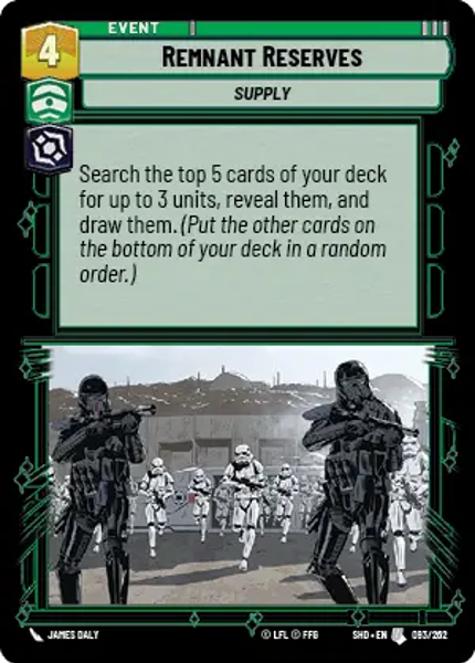 Search the top 5 cards of your deck for up to 3 units, reveal them, and draw them. (Put the other cards on the bottom of your deck in a random order.)