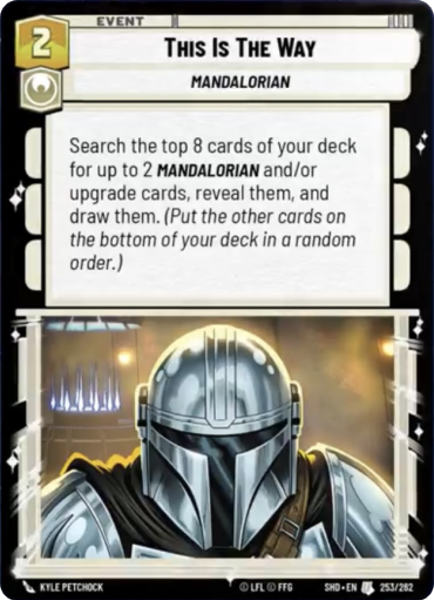 Search the top 8 cards of your deck for up to 2 Mandalorian and/or upgrade cards, reveal them, and draw them. (Put the other cards on the bottom of your deck in a random order.)