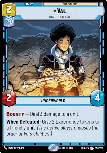 When Defeated: Give 2 Experience tokens to a friendly unit. (The active player chooses the order of Val's abilities.)