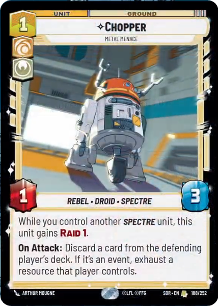 On Attack: Discard a card from the defending player's deck. If it's an event, exhaust a resource that player controls.