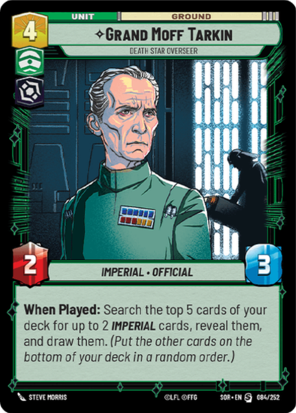 When Played: Search the top 5 cards of your deck for up to 2 Imperial cards, reveal them, and draw them. (Put the other cards on the bottom of your deck in a random order.)