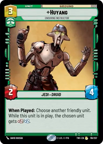 When Played: Choose another friendly unit. While this unit is in play, the chosen unit gets +2/+2.