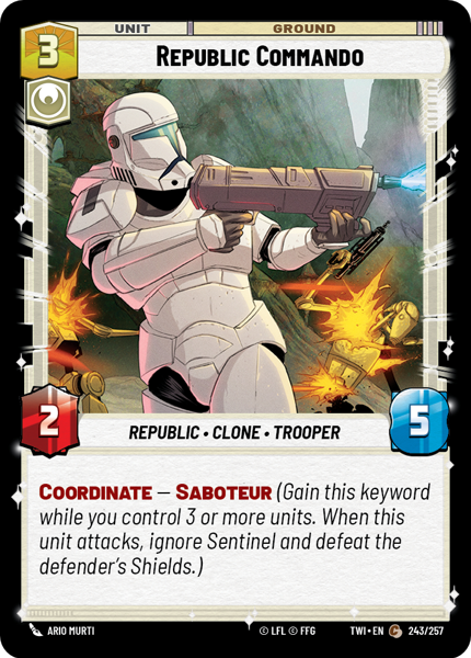 Coordinate - Saboteur (Gain this keyword while you control 3 or more units. When this unit attacks, ignore Sentinel and defeat the defender's Shields.)