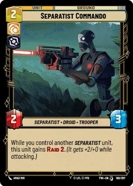 While you control another Separatist unit, this unit gains Raid 2. (It gets +2/+0 while attacking.)